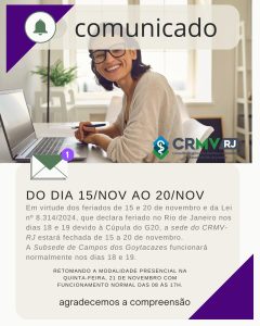Devido os feriados dos dias 15 e 20 de novembro, em que são comemorados o Dia da Proclamação da República e Dia da Consciência Negra, respectivamente; e com base na Lei nº 8.314, de 06/05/2024, do Prefeito da Cidade do Rio de Janeiro, que declarou feriado no âmbito do Município do Rio de Janeiro no dias 18 e 19 de novembro, em razão da realização da Cúpula de Chefes de Estado e de Governo do G20 (“Grupo dos Vinte”) sob presidência do Governo Federal, informamos que a sede do CRMV-RJ estará fechada entre os dias 15 e 20 de novembro.