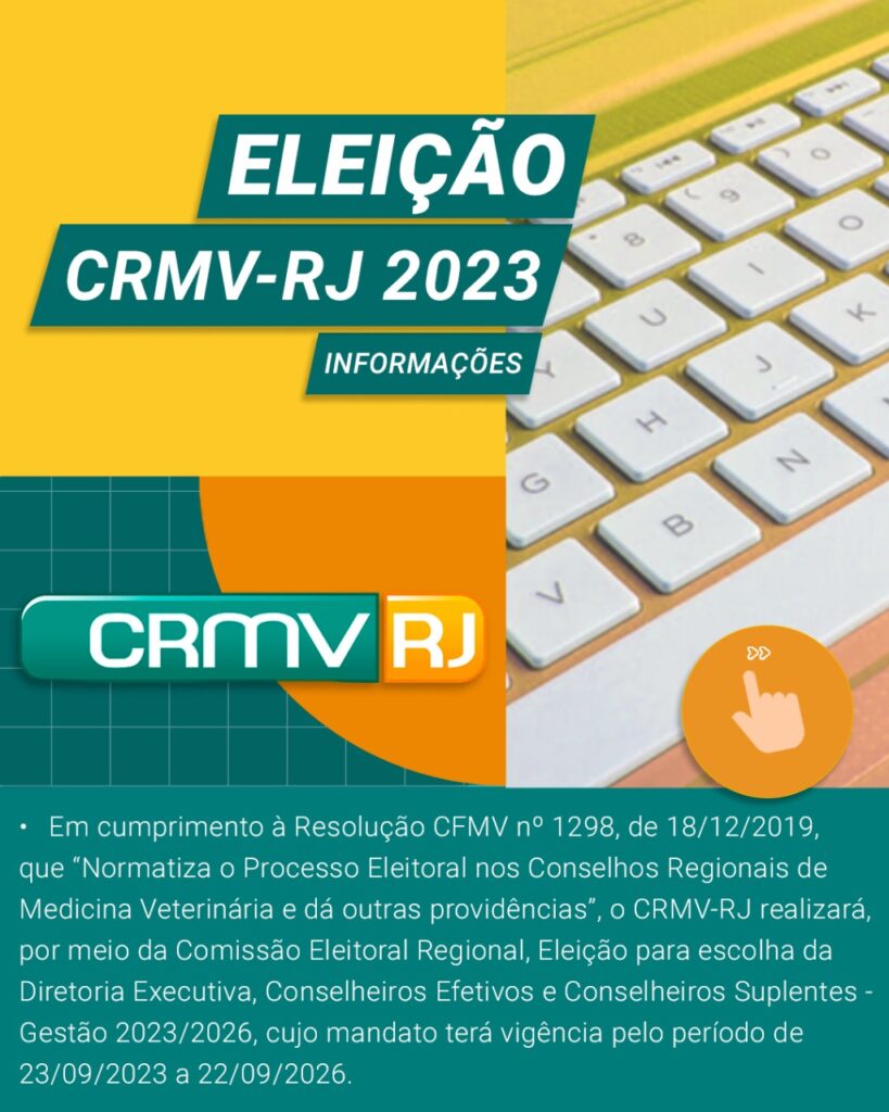 Em cumprimento à Resolução CFMV nº 1298, de 18/12/2019, que “Normatiza o Processo Eleitoral nos Conselhos Regionais de Medicina Veterinária e dá outras providências”, o CRMV-RJ realizará, por meio da Comissão Eleitoral Regional, Eleição para escolha da Diretoria Executiva, Conselheiros Efetivos e Conselheiros Suplentes – Gestão 2023/2026, cujo mandato terá vigência pelo período de 23/09/2023 a 22/09/2026.