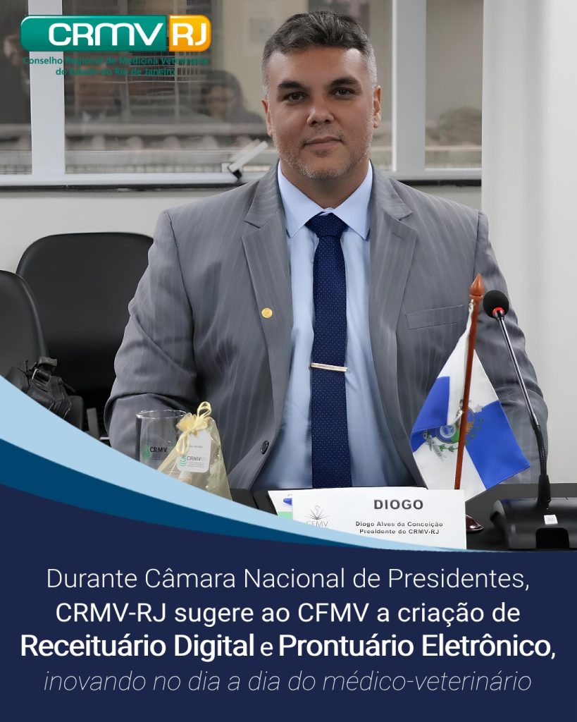 O Conselho Regional de Medicina Veterinária do Rio de Janeiro (CRMV-RJ), representado pelo seu presidente, Diogo Alves, conforme proposto na última campanha eleitoral, sugeriu ao Conselho Federal de Medicina Veterinária (CFMV) a criação de um plataforma digital para a criação de prescrição digital e prontuário eletrônico, tal como acontece hoje com o Conselho de Medicina.