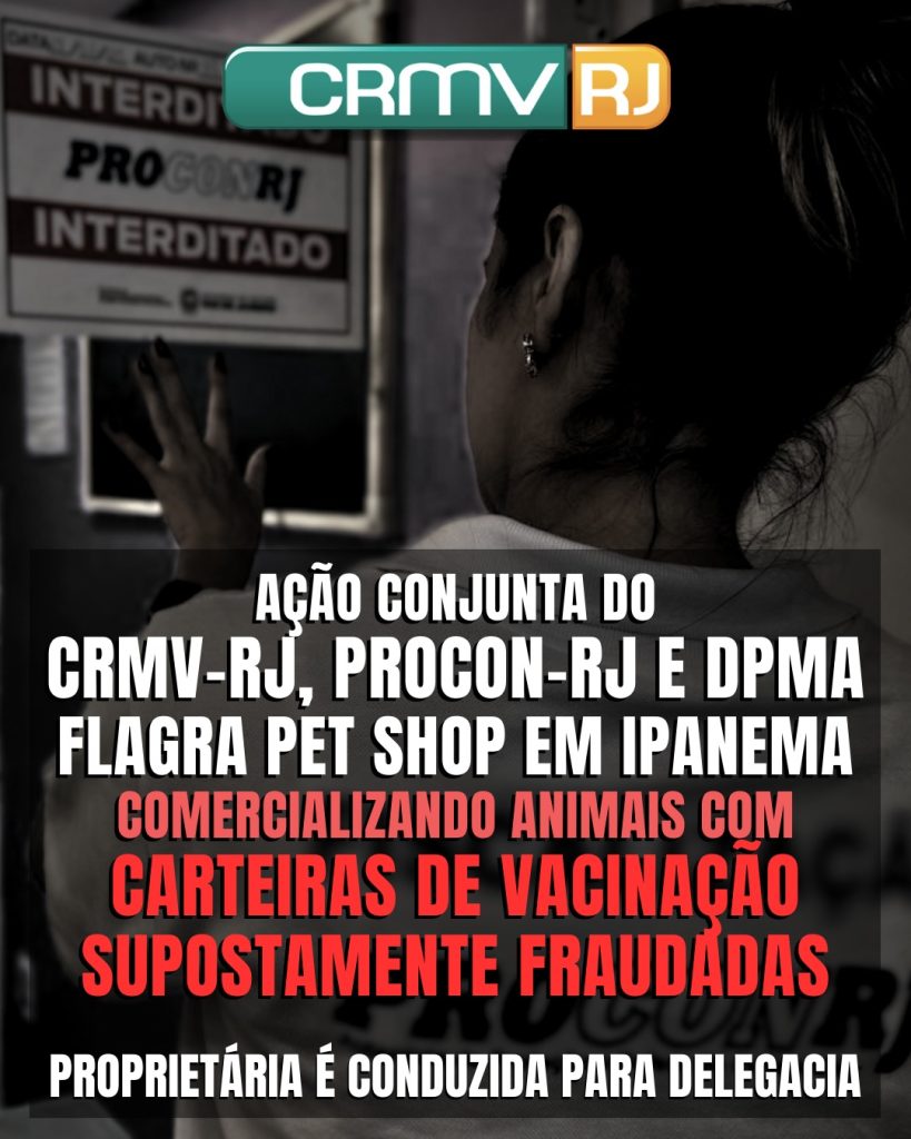 O CRMV-RJ, em conjunto com a Delegacia de Proteção ao Meio Ambiente (DPMA) e o Programa de Proteção e Defesa do Consumidor (Procon-RJ) realizou uma ação na manhã desta quarta-feira (28), em um pet shop em Ipanema, Zona Sul do Rio de Janeiro, com objetivo de averiguar a venda de animais supostamente doentes que estariam sendo comercializados no local.