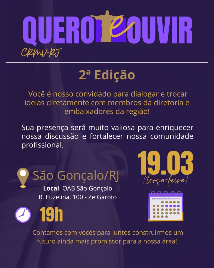 O Conselho Regional de Medicina Veterinária do Rio de Janeiro (CRMV-RJ) anuncia a segunda edição do evento “CRMV-RJ: Quero te ouvir”, que ocorrerá na próxima terça-feira (19), às 19h, na OAB São Gonçalo.