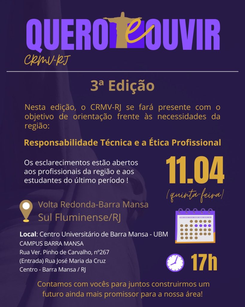 O Conselho Regional de Medicina Veterinária do Rio de Janeiro (CRMV-RJ) agradece à Rádio CBN pelo espaço cedido em horário nobre para conscientizar a população sobre o correto manejo do comportamento da raça pitbull.