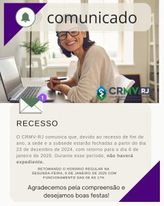O CRMV-RJ comunica que, devido ao recesso de fim de ano, a sede e a subsede de Campos dos Goytacazes estarão fechadas para atendimento a partir do dia 23 de dezembro de 2024. O retorno às atividades será no dia 6 de janeiro de 2025 (segunda-feira), com horário regular de funcionamento, das 8h às 17h.