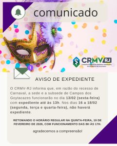 O Conselho Regional de Medicina Veterinária do Estado do Rio de Janeiro (CRMV-RJ) informa que, em razão do recesso de Carnaval, a sede e a subsede de Campos dos Goytacazes funcionarão excepcionalmente no dia 13 de fevereiro (sexta-feira), com expediente até as 13h. Nos dias 16, 17 e 18 de fevereiro (segunda, terça e quarta-feira), não haverá expediente.