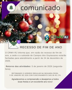 O CRMV-RJ comunica que, devido ao recesso de fim de ano, a sede e a subsede de Campos dos Goytacazes estarão fechadas para atendimento a partir do dia 24 de dezembro de 2025. O retorno às atividades será no dia 5 de janeiro de 2026 (segunda-feira), com horário regular de funcionamento, das 8h às 17h.