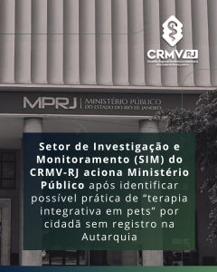 O Conselho Regional de Medicina Veterinária do Rio de Janeiro (CRMV-RJ) encaminhou ao Ministério Público do Estado do Rio de Janeiro (MPRJ) denúncia de um suposto caso de exercício ilegal da Medicina Veterinária. A medida foi tomada após o Conselho receber denúncias relatando que uma mulher estaria se apresentando como médica-veterinária formada, divulgando especializações e oferecendo atendimentos relacionados à área, tanto presencialmente quanto em plataformas digitais.
