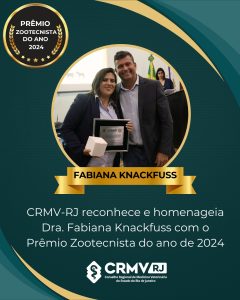 “O CRMV-RJ reconhece o destacado papel da Dra. Fabiana como zootecnista. Sua dedicação, competência e contribuições são de extrema relevância para o crescimento da profissão. Por decisão unânime da VII Sessão Plenária Ordinária, realizada em abril de 2024, temos a honra de conceder a ela o título de Zootecnista do Ano, como forma de agradecimento e reconhecimento pelo seu compromisso com a excelência profissional”, declarou Dr. Julio.