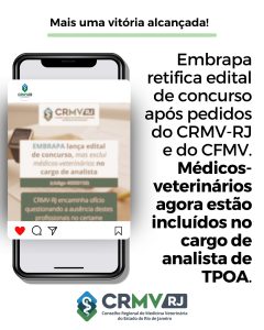 No dia 8 de dezembro, conforme divulgado nas redes sociais do Conselho Regional de Medicina Veterinária do Rio de Janeiro (CRMV-RJ), foi enviado um ofício à Empresa Brasileira de Pesquisa Agropecuária (Embrapa) solicitando a retificação do edital de seu concurso público para a inclusão de médicos-veterinários no cargo de Analista na área de Ciência e Tecnologia de Alimentos (TPOA) – Subárea de Ciência de Alimentos de Origem Animal.