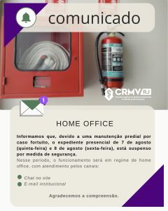 O Conselho Regional de Medicina Veterinária do Rio de Janeiro (CRMV-RJ) informa que o expediente presencial estará suspenso nos dias 7 e 8 de agosto (quinta e sexta-feira), como medida de segurança, em razão de uma manutenção predial programada após o princípio de incêndio ocorrido recentemente nos elevadores do prédio-sede.