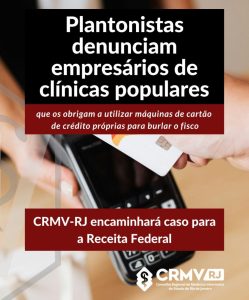 Recentemente, o CRMV-RJ tomou conhecimento de uma prática ilegal por parte de empresários de clínicas populares de pequenos animais. Médicos-veterinários plantonistas estão sendo obrigados a terem máquinas de cartão de crédito vinculadas ao seu CPF, com o intuito de burlar o fisco.
