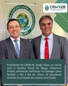 Você já teve dúvidas na emissão de receitas e no acesso ao Sipeagro? A grande maioria dos médicos-veterinários que atua na clínica de pequenos animais certamente responderia que sim. Diante das dificuldades enfrentadas por muitos profissionais, o presidente do Conselho Regional de Medicina Veterinária do Rio de Janeiro (CRMV-RJ), Diogo Alves da Conceição, articulou uma reunião com o Auditor Fiscal Federal Agropecuário do Ministério da Agricultura e Pecuária (Mapa), Cleverson Freitas, buscando soluções práticas para facilitar a rotina dos clínicos.