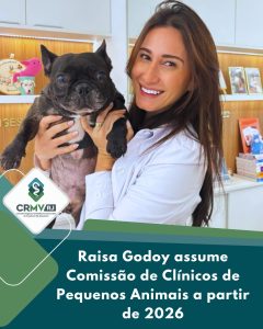 O Conselho Regional de Medicina Veterinária do Rio de Janeiro (CRMV-RJ) anuncia a nova composição da Comissão de Clínicos de Pequenos Animais para o triênio 2026-2029, com médicas-veterinárias Raisa Godoy na presidência e Eloisa Holanda como membro, empossadas a partir de 1º de janeiro de 2026.