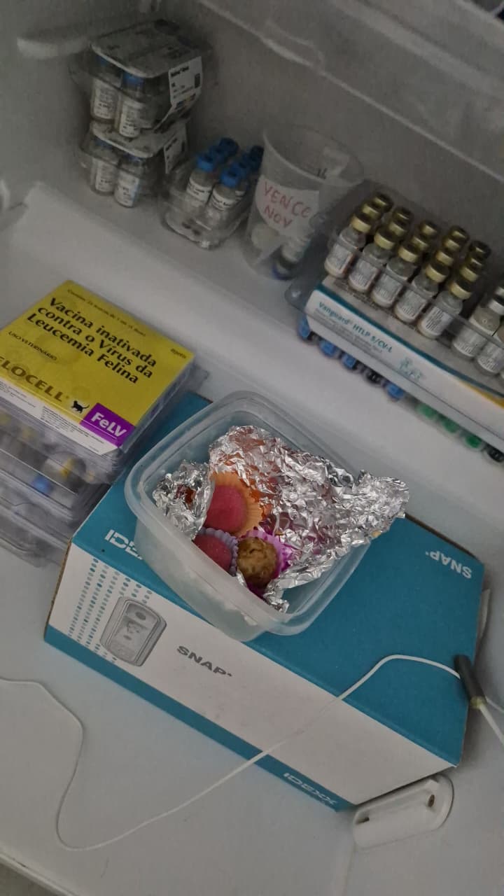 Ainda em Cabo Frio, outra irregularidade recorrente foi constatada em outro estabelecimento: o uso incorreto do refrigerador destinado ao armazenamento de vacinas. Os fiscais encontraram doces de festa acondicionados junto aos imunobiológicos. O CRMV-RJ alerta que essa prática pode comprometer a eficácia das vacinas, visto que o acondicionamento de produtos estéreis e contaminados em um mesmo refrigerador representa risco de contaminação cruzada. Além disso, o uso incorreto do refrigerador pode levar ao comprometimento da eficácia das vacinas, pois a temperatura inadequada pode ser responsável pela degradação dos princípios ativos e, consequentemente, pelo fracasso da imunização.